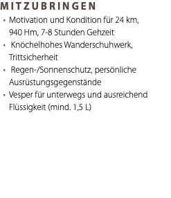 940 Hm, 7-8 Stunden Gehzeit Knöchelhohes Wanderschuhwerk, Trittsicherheit Regen-/Sonnenschutz, persönliche Ausrüstungsgegenstände Vesper für unterwegs und ausreichend Flüssigkeit (mind. 1,5 L) LEISTUNGEN Zertifizierte Wanderführung Versicherung An-/Abreise mit ÖPNV ab/bis